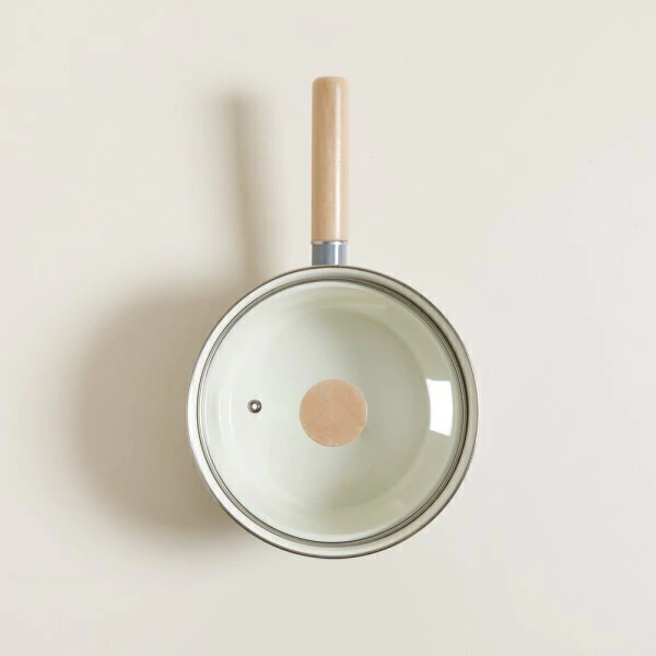 Cacerola enlozada de 20 cm en tono gris con mango lateral y tapa de vidrio templado con pomo de madera. Su diseño combina funcionalidad y estética moderna, ideal para cocinar y presentar directamente en la mesa. El esmalte vitrificado asegura una cocción uniforme y una fácil limpieza.